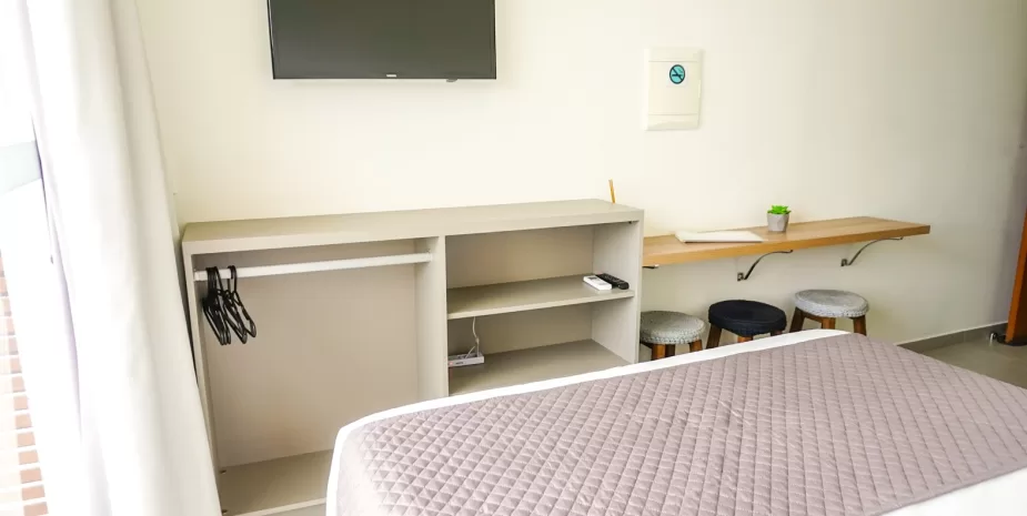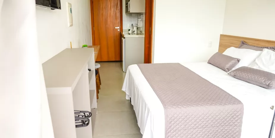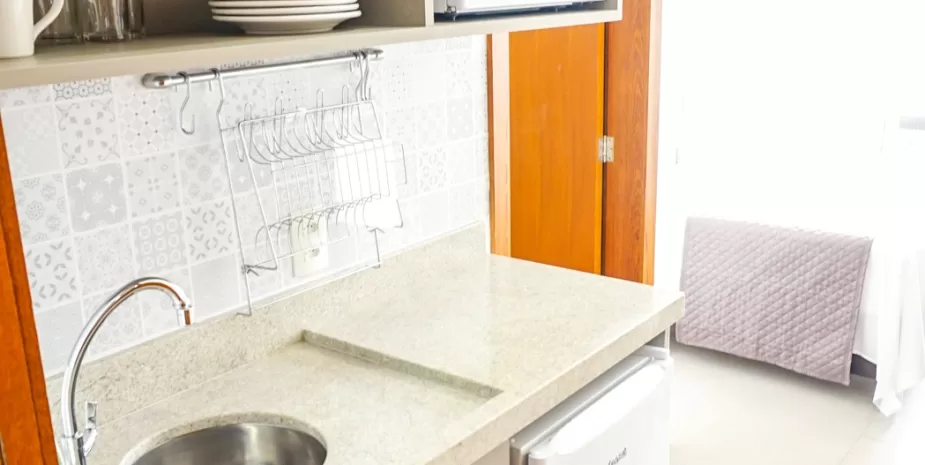É equipada com uma cozinha compacta com frigobar, pia, microondas, bancada de refeições, cafeteira, jarra elétrica, louças e utensílios.